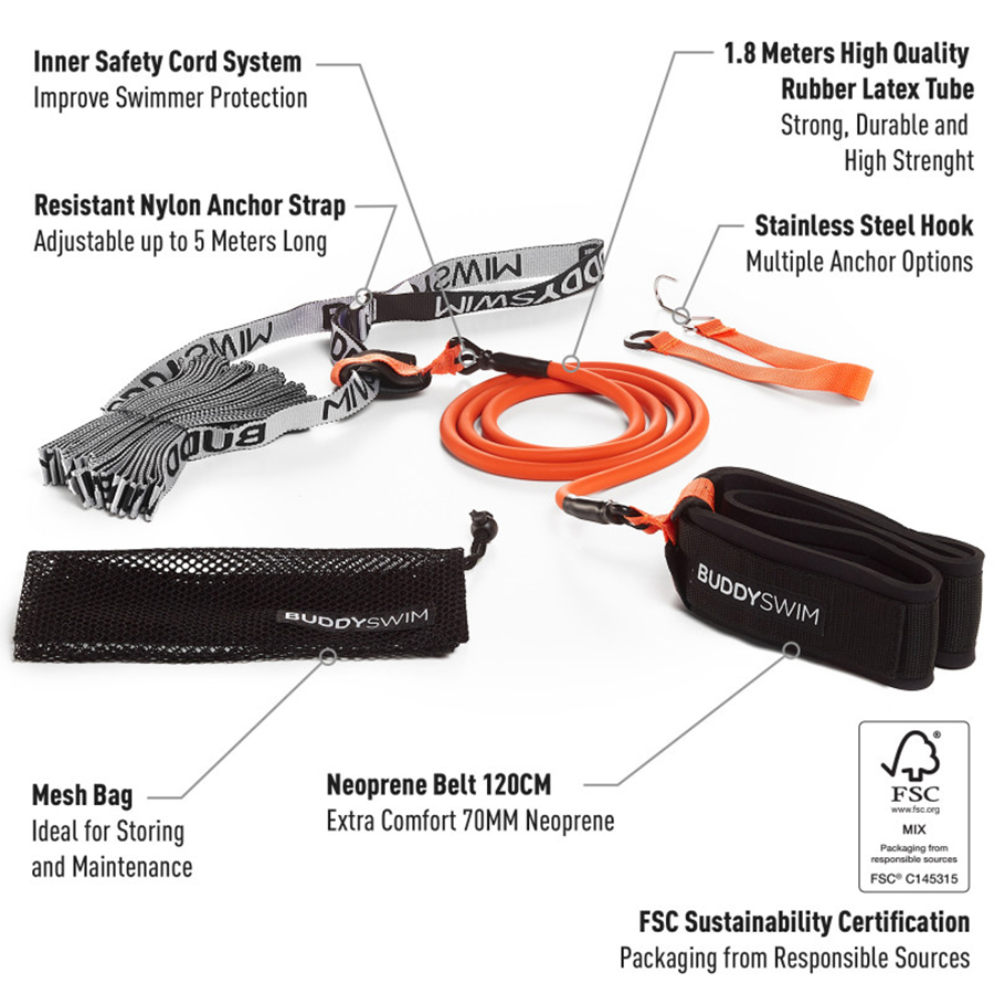 The Stationary Swim Training Belt is designed for uninterrupted swimming in a stationary position in any pool size. Stationary swimming helps swimmers develop endurance and work on hydrodynamic body positioning and stroke technique. The innovative Internal Safety System (ISC) of the elastic band prevents exceeding the maximum elongation and protects the swimmer in the event of a band break. The comfortable 70mm wide neoprene belt with Velcro closure allows for easy and comfortable adjustment. A mesh bag is included for transport and storage.