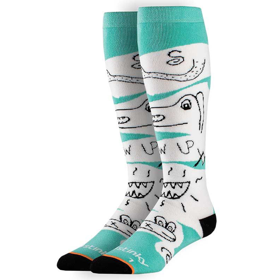The ergonomic design offers targeted cushioning and arch support, reducing fatigue during long hours on the slopes. A seamless toe construction enhances comfort, preventing irritation inside your boots. With bold graphics and durable construction, these socks are perfect for snowboarders and skiers looking to make a statement both on and off the mountain.