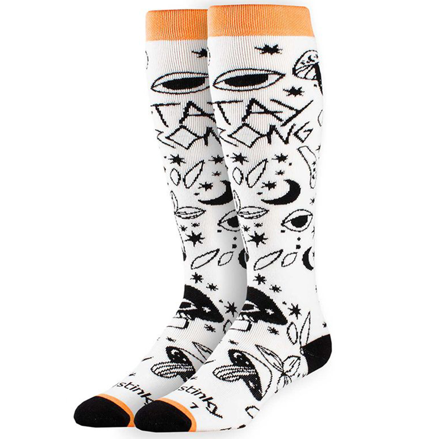 The ergonomic design offers targeted cushioning and arch support, reducing fatigue during long hours on the slopes. A seamless toe construction enhances comfort, preventing irritation inside your boots. With bold graphics and durable construction, these socks are perfect for snowboarders and skiers looking to make a statement both on and off the mountain.